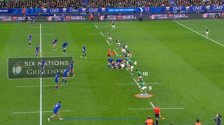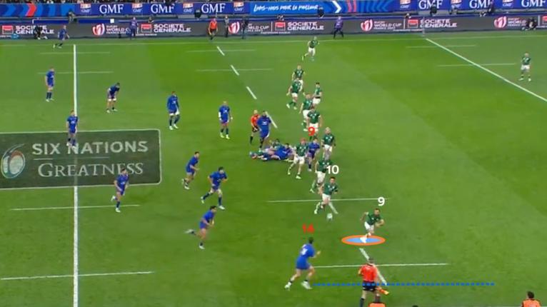 The force of the monstrous French prop punctures through Hansen and indents the Irish defence, sucking in multiple defenders and leaving Gibson-Park (9) isolated on the outside.