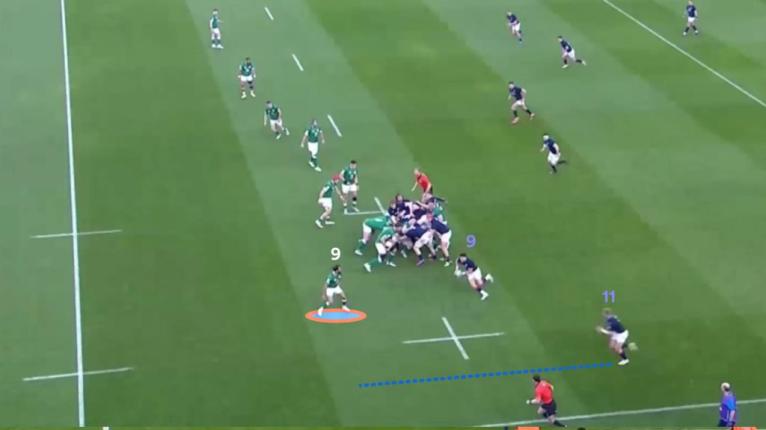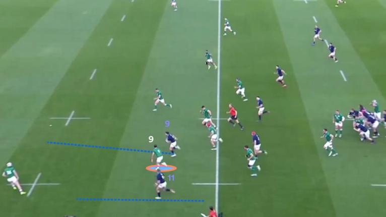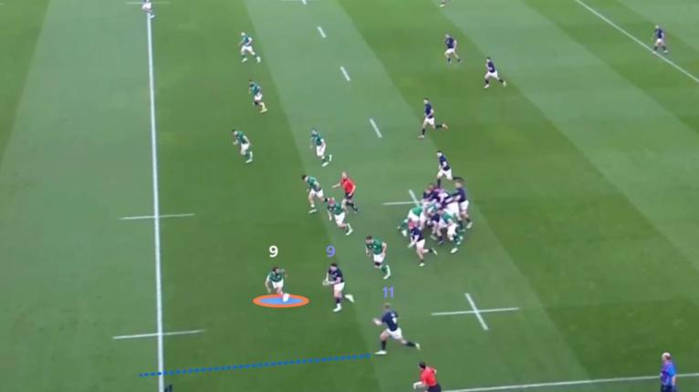 Scotland had Gibson-Park isolated with a two-on-one against Ali Price (9) and Duhan van der Merwe (11). The Irish halfback did a great job of shading both players and forcing Price inside, but Scotland still peel off a massive line break.