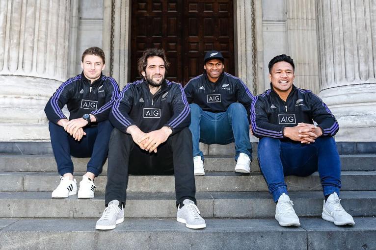(L-R) All Blacks players Beauden Barrett, Sam Whitelock, Keven Mealamu and Waisake Naholo sit on the steps of St. Paul’s Cathedral during an open top bus tour with sponsor AIG on September 26, 2015 in London, England. (Photo by Miles Willis/Getty Images for AIG).
