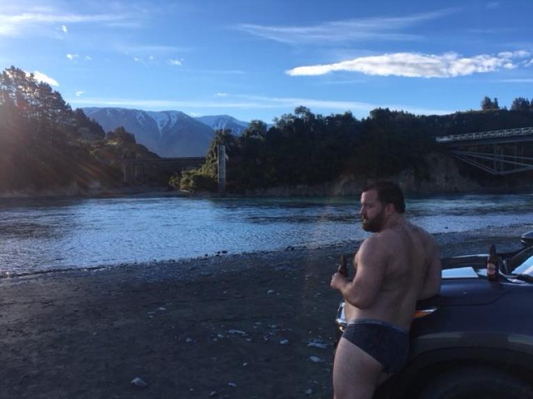 Having eschewed the opportunity to partake in a beer, I loaded the boys into the car for our final retreat. The late afternoon light was as soft as a puppy’s tail as we headed out of town. We made one quick stop at the Brown pub, for supplies, and another on the river stones of the Rakaia so Chips could live up to his promise of a nude swim. The water, cold and blue like an ex-wife’s heart, rushed along at an icy clip, but Chips would not be dissuaded from his sundowner skinny dip.