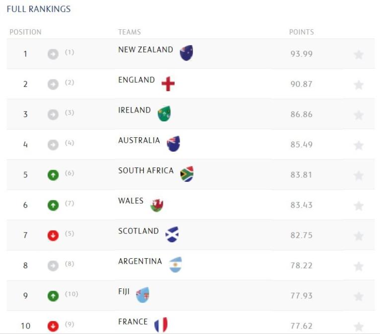 France meanwhile, who lost against Ireland with the last kick of the game, have fallen to an all-time low of 10th, with Fiji the beneficiary.