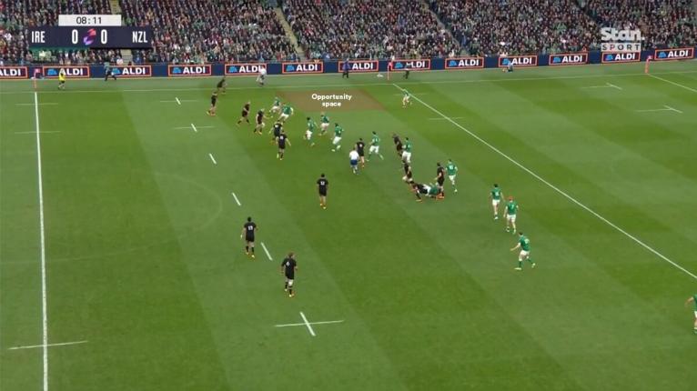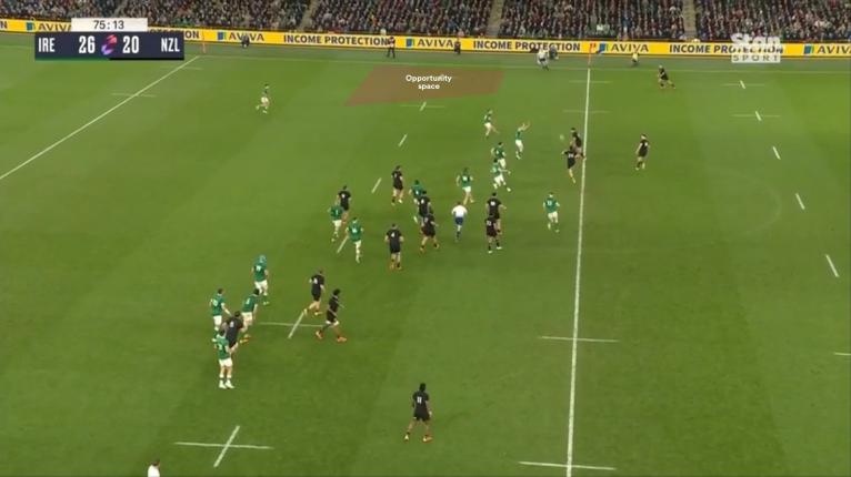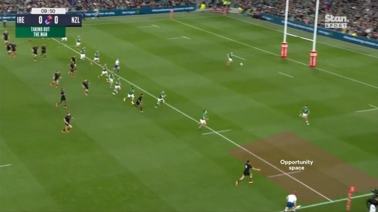 On this occasion, it’s reserve midfielder David Havili who opts for a kick-pass to get the ball beyond the narrow Ireland defence, but it’s clearly not a planned move because Jordan is not in a great position as the key chaser.