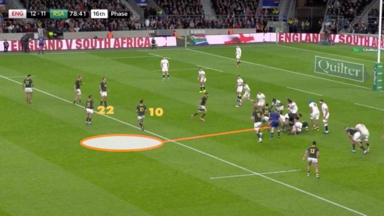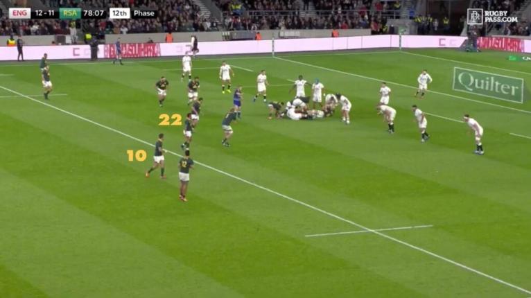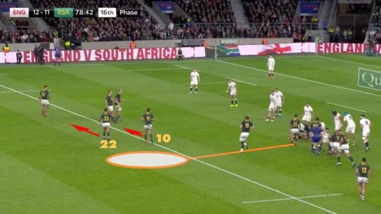 From 11-metres out, right in front, the Springboks instead play three runners around the corner towards the left edge off Papier, moving further and further away from the posts.