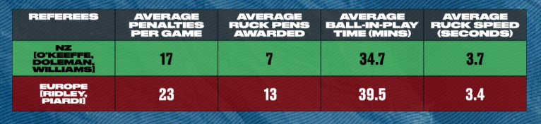 The two Europe-based referees [Piardi and Christophe Ridley] have awarded more penalties and a higher proportion of them have been at the ruck – 57% as against 41% awarded by the Kiwi officials. At the same time, they have produced two games with almost five minutes more ball-in-play time, with a notable increase in the speed of ruck delivery.