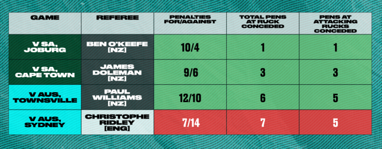 On Saturday he helped produce an open, exciting spectacle with 41 minutes of ball-in-play time and 218 total rucks in a game featuring only 21 penalties. He found solid mitigation and a good reason to avoid a yellow card after Wallaby skipper Harry Wilson made accidental contact with the head of Argentine scrum-half Gonzalo Garcia in the tackle and he was consistent in punishing negative play. Two deliberate knock-ons resulted in one yellow card apiece for Max Jorgensen and Santi Carreras. Ultimately Ridley created a framework for both sides to play and utilise their skills. What more can you ask?