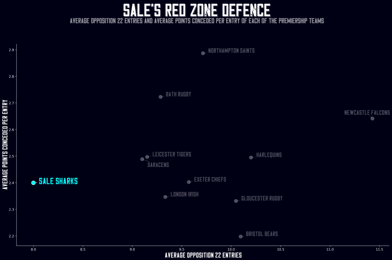 The two obvious metrics behind conceding tries are how many times you let teams into your 22 and how good you are at stopping them form scoring when they are in your 22. The graph below sheds some light on Sale’s performance in both areas. They are only the 4th best team for average points conceded per 22 entry (2.4), with Irish (2.35), Gloucester (2.33) and Bristol (2.2) slightly ahead of them. However, it is their ability to stop teams getting into their 22 where Sale really excel, giving teams an average of just eight entries per game, 1.1 less entries than the second best team in this area, Saracens.