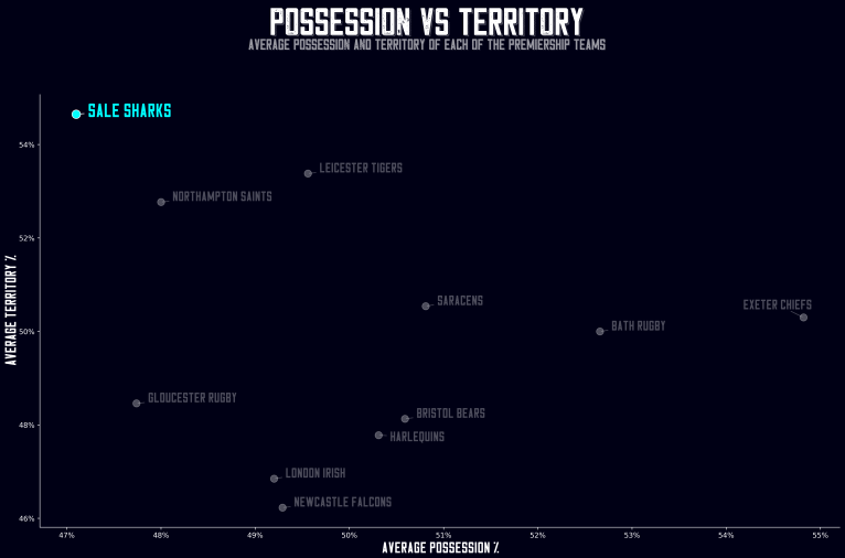 By giving teams just eight entries a game it could be assumed Sale spend more time with the ball than without it. However, Sale have had the lowest possession of any team this season, averaging 47% a game. In comparison, they are the top team for average territory, at 55% a game. Together, these stats point towards Sale’s ability to put the ball in the right areas (second highest team for average kicks per game with only Leicester kicking more) and defend long phases in the opposition’s half.