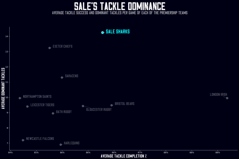 The above graphics have shown an array of metrics which point to while Sale are such a strong defensive outfit, but first and foremost, defence is built on winning collisions and Sale do that better than anyone. They average the most dominant tackles a game (14.3), over one more than next best Exeter (13.2) and three more than third placed Saracens (11.3) and furthermore, only two teams have a better tackle completion than Sale (86%). It is quite remarkable that of the 13 players who are ranked in the top 10 for dominant tackles made this season, seven play for Sale.