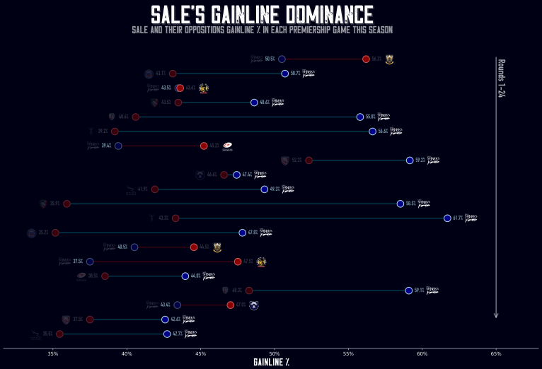 The combination of Sale’s defensive dominance and tackle accuracy has seen them win the gainline battle in 14/20 of their premiership matches this season. The graph below shows Sale and their opposition’s attacking gainline % for each game, with red bars indicating when a team has got the better of Sale. Northampton have won the gainline battle vs Sale in both of their fixtures, suggesting they have the skillset to get round them. Interestingly, their biggest positive gainline difference vs their opposition has come against their semi-final opponents this weekend.