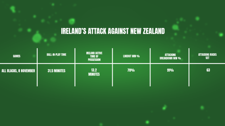 Against New Zealand, the ball-in-play time took a further cut of a minute and a half, with Ireland’s portion down to a meagre 13 minutes of possession; the number of rucks built dropped to almost half of the customary Irish output at the Six Nations and the lineout fell by a further 10%.
