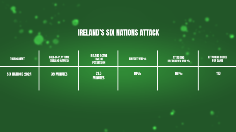 When Ireland struggle to impose their own tactical grid on a game of rugby, a typical pattern begins to emerge: the ball-in-play time falls dramatically, by over six minutes per game, and it is Ireland’s time in possession of the ball which is being eaten up in the process. The number of rucks they set falls by an average of 26 per game and the lineout loses 11% of its effective traction as the primary set-piece starter.