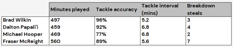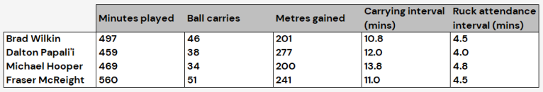 Both provided a lineout option on their own throw with four takes apiece. On defence, they also had the highest tackle completion rates, with Wilkin once again topping the work-rate charts while Fraser McReight was the most dangerous on-baller.