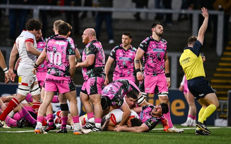 Ospreys, reacting to Cormac Izuchukwu’s try, were left frustrated in Belfast (Photo By Ben McShane/Sportsfile via Getty Images)