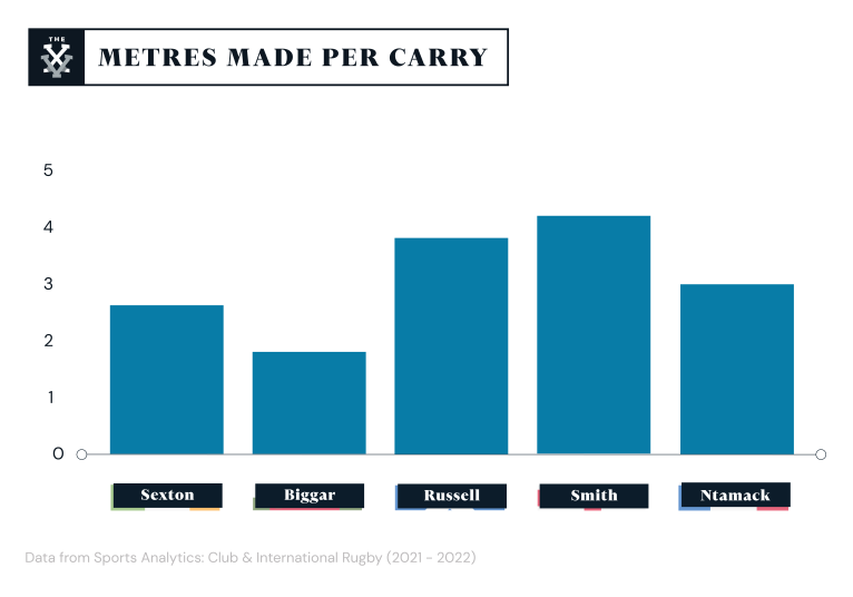 However, Ntamack is not alone in his ability to light up matches with dazzling carries. His counterparts in Finn Russell and Marcus Smith also post impressive running records. Smith’s spring in his step and low centre of gravity help him to slip tackles and he averages 4.2 metres gained per ball carry. Russell is not far behind with an average of 3.8 metres gained each time he carries.