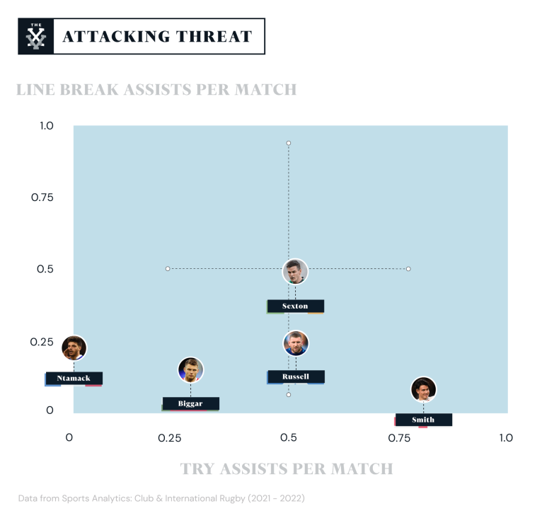 The form of Marcus Smith at club level means that he goes into the Six Nations this year with the best record of creating chances through his passing play. Smith has assisted an average of 0.8 tries in each match he plays in, a testament to his importance in the Harlequins squad.