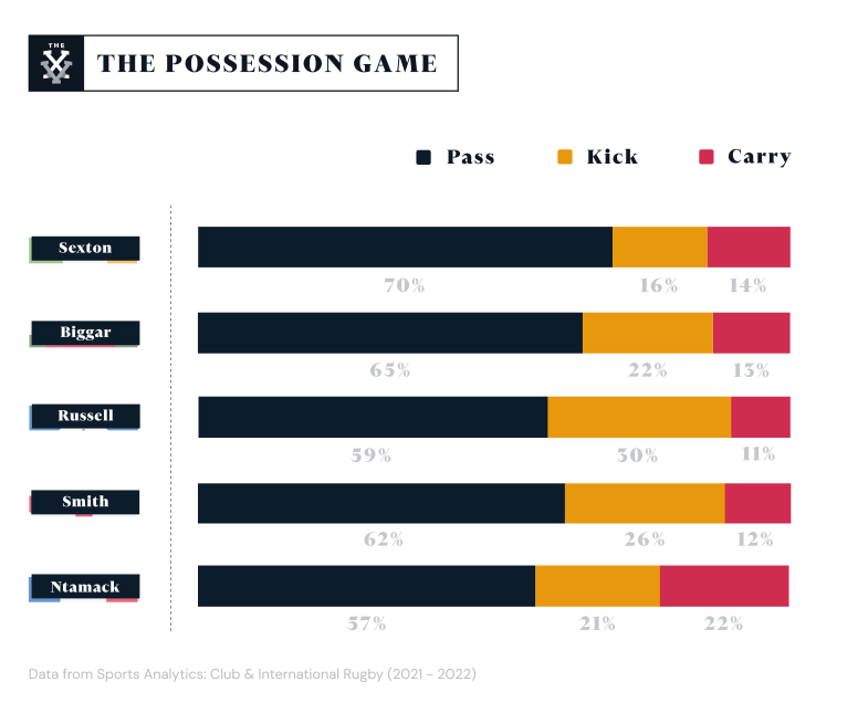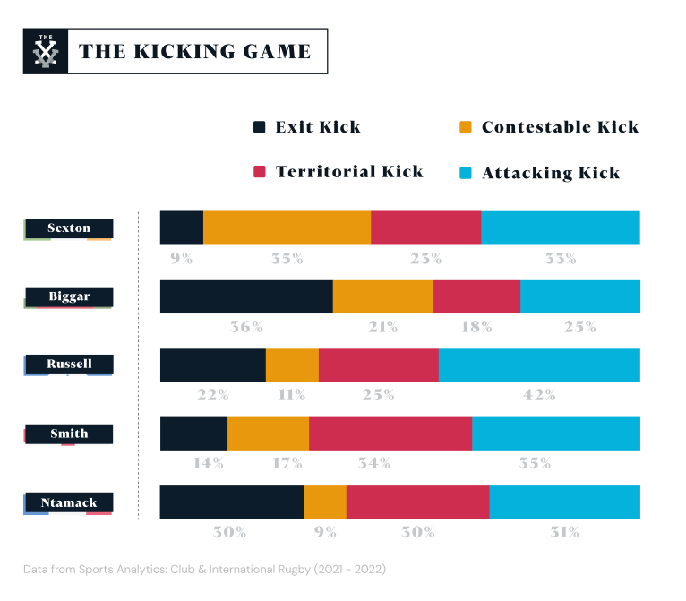 Breaking down these decisions reveals the tactical intent of a fly-half. Since the start of 2021, Finn Russell kicks 30% of the time he has possession, almost twice as much as Johnny Sexton has during the same time period. Scotland fans, enamoured by the attacking instincts of their 29-year-old fly-half, will know that a number of invariably deft kicks either put opposing defences under immense pressure or create a genuine try-scoring opportunity.