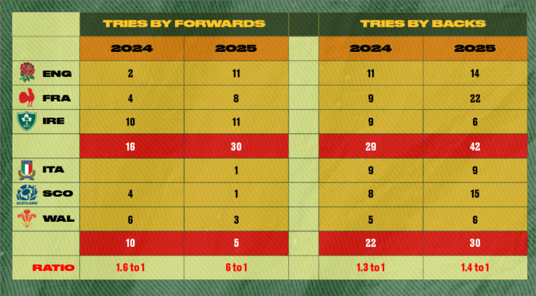 - Les Bleus scored the most tries [30] and conceded the fewest [11]. Their ratio of tries to penalty goals exploded to 4:1, up from 1:1 in 2024.