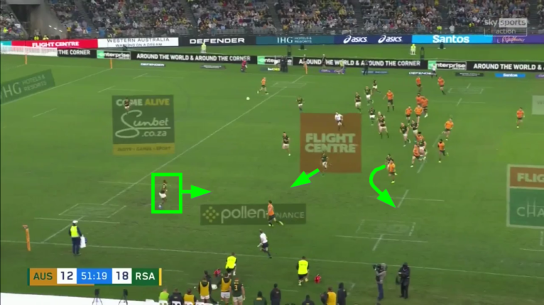 On this occasion Wright’s cross-kick goes to the other side, but the catcher [number 15 Aphelele Fassi] has already dropped off to receive it rather than jamming in as the outside ‘horn’ on the defensive edge. With Kolbe and Lukhanyo Am scrambling back in enthusiastic support, three of South Africa’s most dangerous men are concentrated in a thinly-defended area.