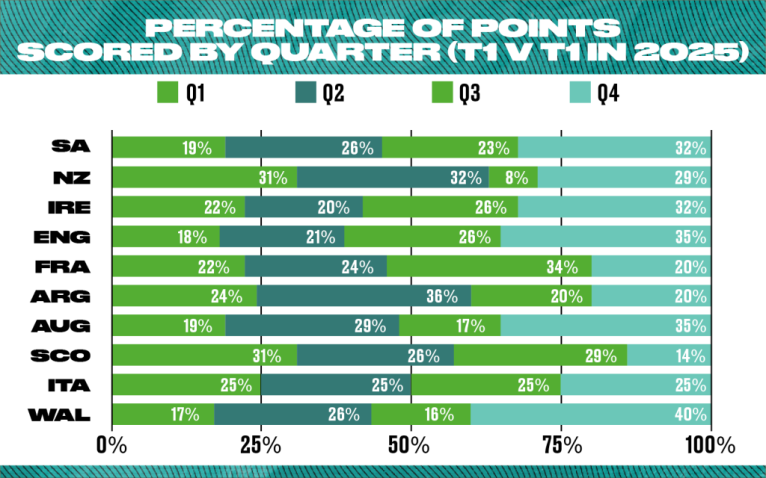 Interestingly France have the highest % of points in that third period of the game after halftime yet that was when they struggled against the Springboks, not executing 2/3 opportunities to score tries which likely would’ve killed the game.