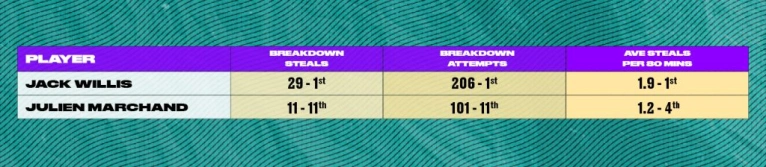 The contest which epitomised the Glasgow spirit-in-the-storm best was the ongoing battle between the Warriors’ attacking cleanout and those two outstanding Toulousain breakdown defenders, Jack Willis and Julien Marchand. The Top 14 produces an unholy number of excellent disruptors at the post-tackle, but Willis and Marchand represent la crème de la crème. Take a look at the raw stats from last year’s Champions Cup.
