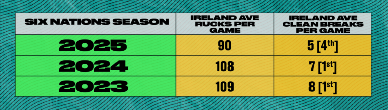 Current Leinster set exactly the same number of rucks per game as 2025 Six Nations Ireland at 90 per game, but that is well short of the numbers posted by the men in green in their last two Grand Slam and championship-winning years.