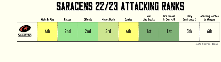 Below is a snapshot of where the increases in Saracens attack have put them in the 2022/23 season ranks. Saracens are ranked 4th for both average kicks in play and average carries, however none of three teams ranked above them for kicks in play (Leicester, Sale and Gloucester) are in the top three for carries (Exeter, Northampton, Bristol). Exploring these two stats further, on average, teams are ranked five places apart for kicks and carries (for example, Northampton are ranked 2nd for Carries, but 7th for kicks) so Saracens sit as a bit of an anomaly in being so closely ranked for both. The fact that Saracens are ranked 1st for linebreaks and linebreaks from their own half highlights just how dangerous their attack has been this season.