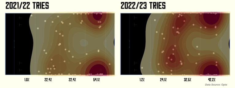 For a final look at comparing Saracens’ last two seasons, the two pitch maps below show the possession starting points for each of their tries from the last two seasons. These maps display how Saracens have been scoring from deeper this season. Last season, 54% of Saracens tries started in the opposition’s 22, with the map showing that the majority of these started on the touchlines (lineouts), supporting the idea that Saracens played by winning penalties and strangling the opposition with their kicking game. This season, only 42% of their tries have started in the oppositions 22, with a 10% increase in tries that began between halfway and the oppositions 22. In addition, the current season’s map highlights how a large proportion of the tries from this area are starting closer to the half-way than the oppositions 22.