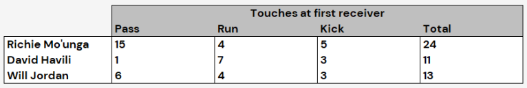 Will Jordan remains at first receiver with Richie Mo’unga following play from the backside. The kick down the far-left channel is made by a wing (Leicester Fainga’anuku), with second five-eighth David Havili chasing it beyond him. It was typical of the interchangeability within the red-and-black backs, which saw all seven starters feature at first receiver at some point during the game.