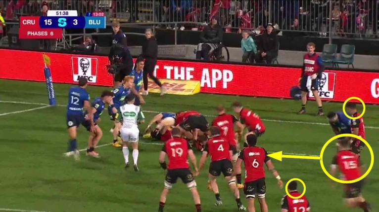 Jordan is the main man in midfield, with Mo’unga out to his right and Havili manning the short side. When play bounces back in from the right touch, the Crusaders10 and 15 have not bothered to swap roles, and Jordan is still the key receiver creating space out on the far left for number 8 Cullen Grace.