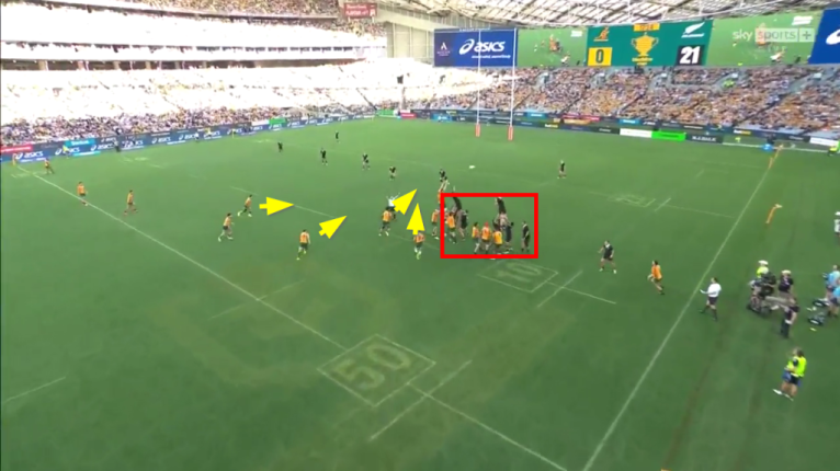 It means six New Zealand forwards are fully occupied with jumping and lifting, and only two [Ethan de Groot at the front and Sam Cane in midfield] with defending. Neither are in any position to influence the play as Fraser McReight strolls through a hole around the end of the lineout so yawning any one of four Australian players could have scored the try. It looked for all the world like a training run.