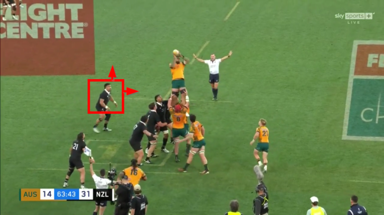 Throughout the game the All Blacks adopted a risky policy of ‘jacking’ two jumpers up into the air on the Wallaby lineout throw. They won four turnovers from it but the little victories were bought dearly. In this instance both Scott Barrett and Wallace Sititi are airborne and the defensive tail-gunner [hooker Codie Taylor] is glued to Sititi’s backside.