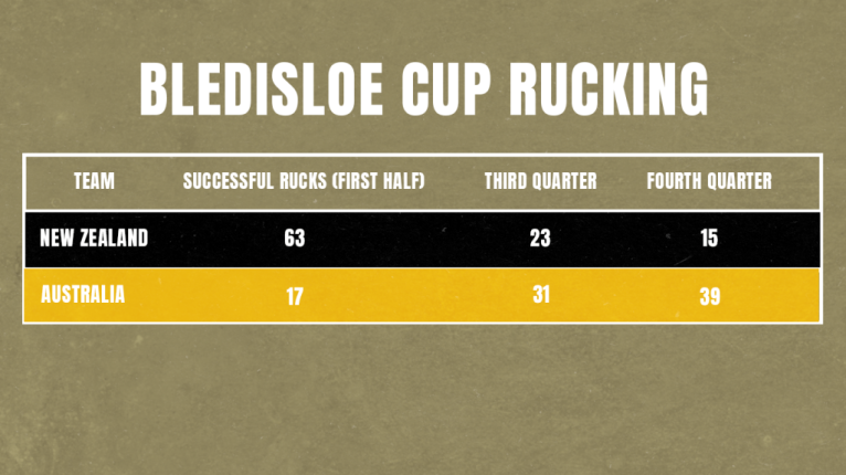 As the All Blacks dwindled, so the Wallabies burgeoned in the high stakes game of ball retention. If you can keep the ball for 70 rucks in one half of footy, you will not be doing much defending at all, and that kept the worst of the pressure off Laurie Fisher’s ailing defence.