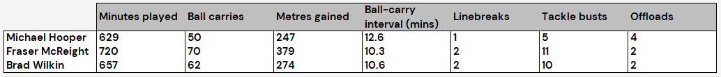 Both the bigger man (Brad Wilkin) and the smaller openside (Fraser McReight) are currently squeezing more value out of their carries and making more tackles on defence. Other points of difference include the four lineouts won by Wilkin and the 12 balls at the breakdown stolen by McReight.