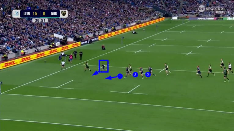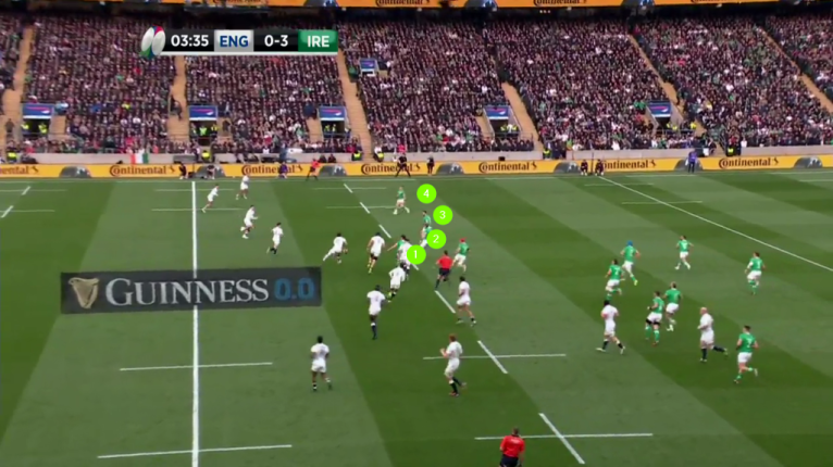 The chase line is that much higher and forces Furbank to pass the ball forward to Freeman on the left edge. It was another win for Nienaber and indirectly, another tactical lesson learned from the England-Ireland encounter.