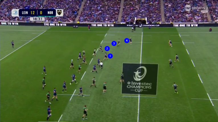 A defence which plays the gaps so religiously will always give up the occasional big play, and this time Smith gets the ball away a split-second before the defenders can reach the passing channel outside him. That is where Nienaber plays his second trump card. After the break has been made, the high line of D still leaves space for no less than three Leinster defenders to hare for the corner flag in cover, not least loose-head prop Andrew Porter. Everyone fights, or runs, and absolutely nobody quits.