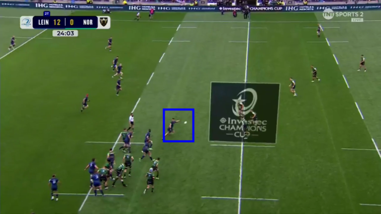 The Leinster forwards are not concerned with marking men and reading off their actions, they are rushing gaps and looking for turnovers, with hooker Dan Sheehan inches away from intercepting the pass from Alex Mitchell in the second clip.