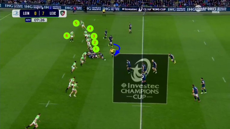 Leinster are once again in their 14-1 overload shape – this time out to the right – but the “1” [Sheehan, out of shot on the sideline] is occupying the attention of five Leicester defenders to that side. With the home side’s ability in the short passing game, that is an invitation to disaster.
