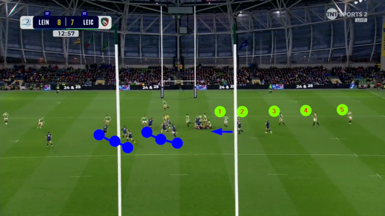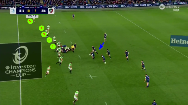 Fourteen of the 15 home players are in the middle of the pitch between the two 15m lines, while there are six Leicester defenders stuck out on the left versus only two Leinster attackers.
