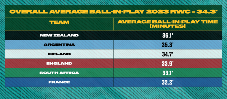If you use the ‘game duration’ matrix, there is less than one minute thirty seconds between all the team averages, but the ball-in-play stats reveal some genuine differences in approach to the game.