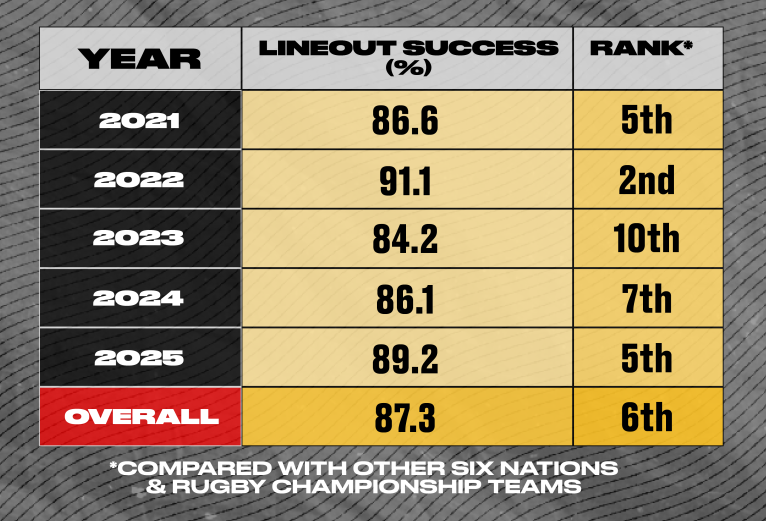 Ireland are currently at 89.2% lineout success for 2025 but those numbers are inflated by going 93.5% (29 lineouts won from 31) in the summer tour games against the vastly inferior Georgia and Portugal.
