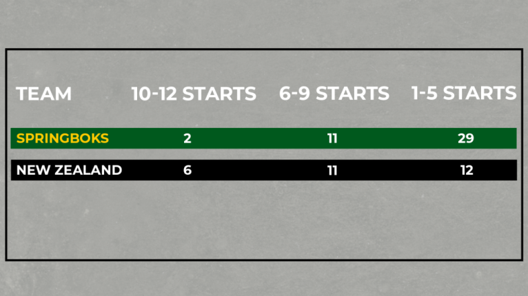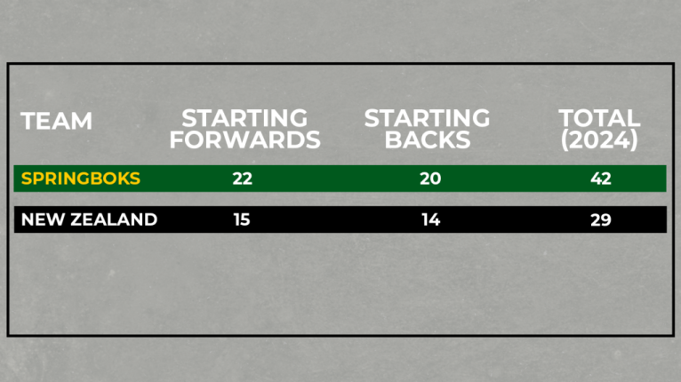 A second set of numbers illustrates the narrow, ‘vertical’ axis of All Blacks selection compared to the Springboks’ wider ‘horizontal’ spread very well.