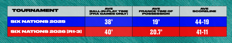 The raw mid-term stats after three rounds of the Six Nations attest to the effectiveness of the key decisions Galthié has made. The basic table illustrates the higher ball-in-play, and greater active time of possession Les Bleus have been able to manage.