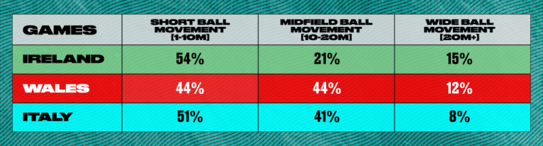 Critical to Galthié’s new vision of the game has been the selection of UBB wizard Matthieu Jalibert at 10, and two mobile second rowers who have played international rugby in the back-row in Mickael Guillard and Charles Ollivon. The following table shows how France’s attack pattern changed between the first two rounds versus Ireland and Wales, when Jalibert started, and the third-round game against Italy, which he missed because of injury.