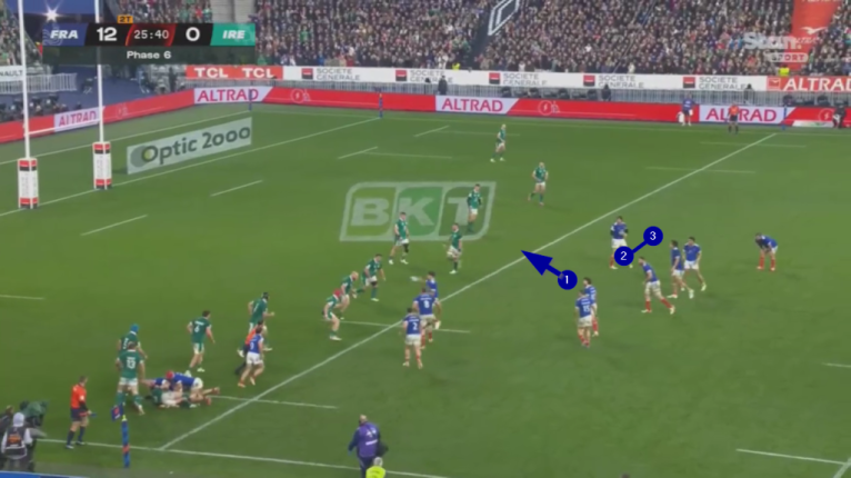 In the second and third clips from the Ireland match, Guillard was the chosen man, able to break the first tackle and run the ball back outside the 22 from exit situations and set up a freer box-kicking scenario for his scrum-half. The picture is completed when his locking partner Ollivon becomes the first man up in support of Louis Bielle-Biarrey on the opposite side of the field.