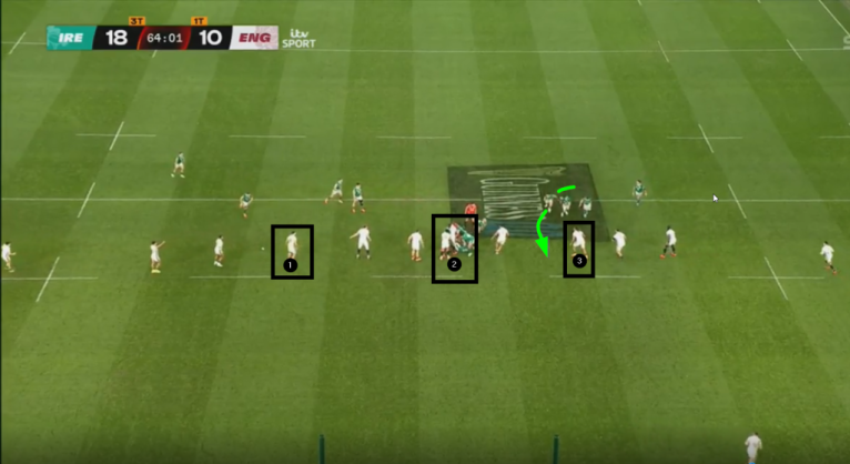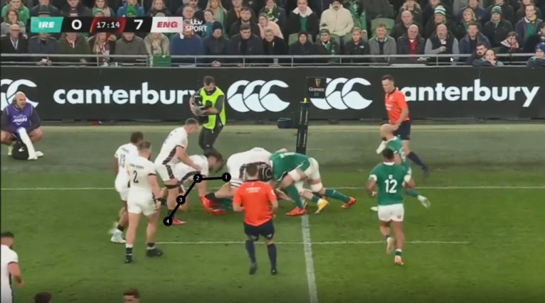 The screenshot illustrates the type of situation England wanted to engineer on defence when Ireland shifted the ball into the far 15m channels: the backline focuses on keeping their cohesion on a drift sideways, and they have four good jackals or counter-ruckers around the ball when the move comes to stop: “1” Tom Curry is already engaged with Caelan Doris at the ruck, Murley “2” is reloading, while “3” Ben Earl and “4” Luke Cowan-Dickie are in close attendance. There are already good prospects for a successful turnover if Earl and Murley commit to the counter-ruck, but in the event the men in white chose to develop their line speed instead.