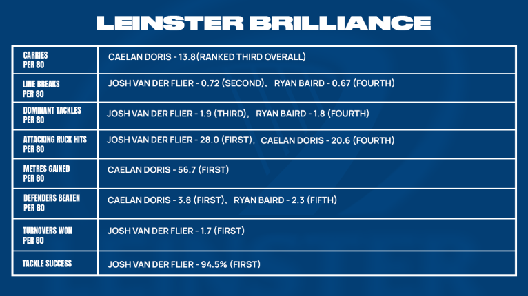 According to Opta, across this season’s Champions Cup, Leinster’s back row ranks highest for tries per game, dominant tackles, metres gained and attacking rucks hit.