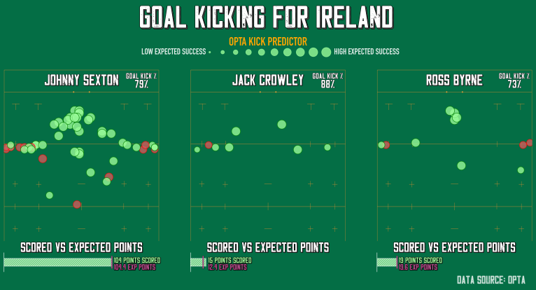 This final section continues the theme of looking at the performances of Johnny Sexton, Jack Crowley, and Ross Byrne in an Ireland shirt, by assessing their goal kicking efficiency, again incorporating Opta’s kick predictor. Unsurprisingly, given the minutes he’s played, Sexton has far more goal kicks (56) than both Crowley (8) and Byrne (11) and is sitting at 79% accuracy, but only 0.4 points below Opta’s 104.4 expected. Although Crowley has only had 8 kicks at goal, he’s nailed 7 of them, putting him 2.6 points ahead of Opta’s expected points, whilst Ross Byrne, who has kicked at goal 11 times for Ireland, has missed three, giving him the lowest success percentage of the three.