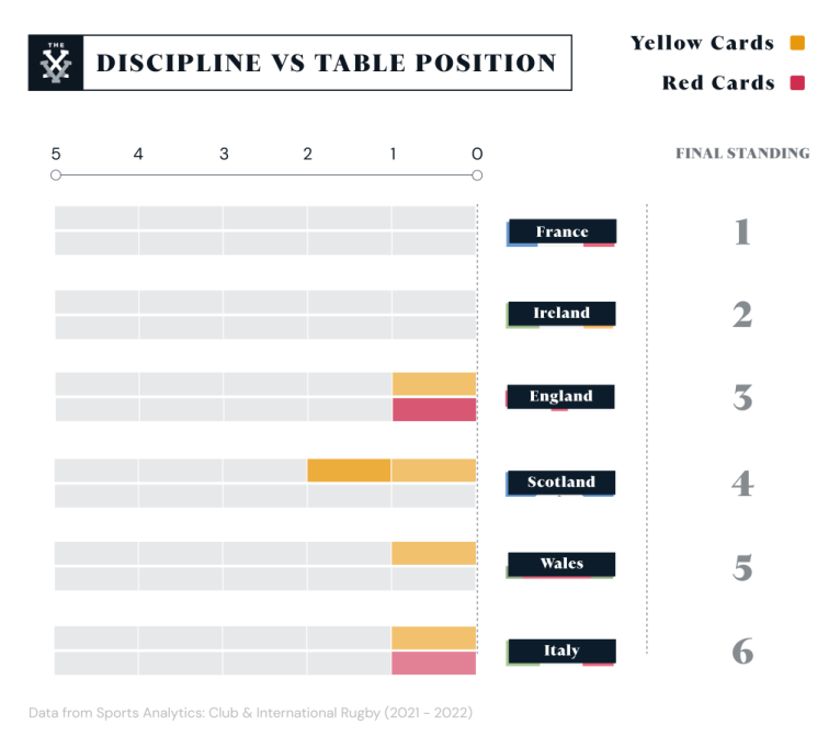 Discipline was relatively good throughout the competition with only seven cards being shown in total. Notably neither Ireland nor France, the tournament’s two top sides, received a yellow or a red card. Instead, time in the bin was mainly reserved for the bottom half of the Six Nations table with Scotland, in Finn Russell and Ben White, being the only side to pick up more than one card.