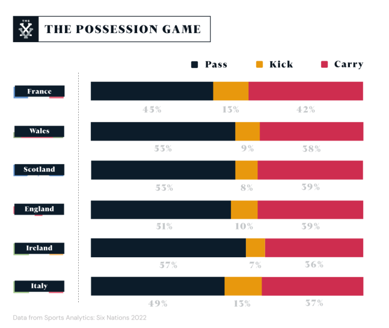 An inspection of the pass-carry-kick ratio, measuring French decision making in possession, shows the faith that this side has in its ball carriers across the field. The French carried more than any other side in this year’s Six Nations and passed the ball on the fewest occasions. The importance of the French backrow to their performance in possession can’t be overemphasised here. No 8 Gregory Aldritt carried 65 times, the most of any player in the tournament and nine more times than Stuart Hogg (56), who ranks second on this list.