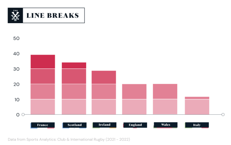 Ninety-five per cent of these line breaks happened within 18m of a touchline. These were targeted attacks intended to dismantle defensive structures from the flanks. Gabin Villière was the first line of attack in this sense and accumulated a total of 12 line breaks for the entire tournament, the most of any player, even though he missed the Wales game. Damian Penaud sits at third on this list with eight linebreaks to his name.